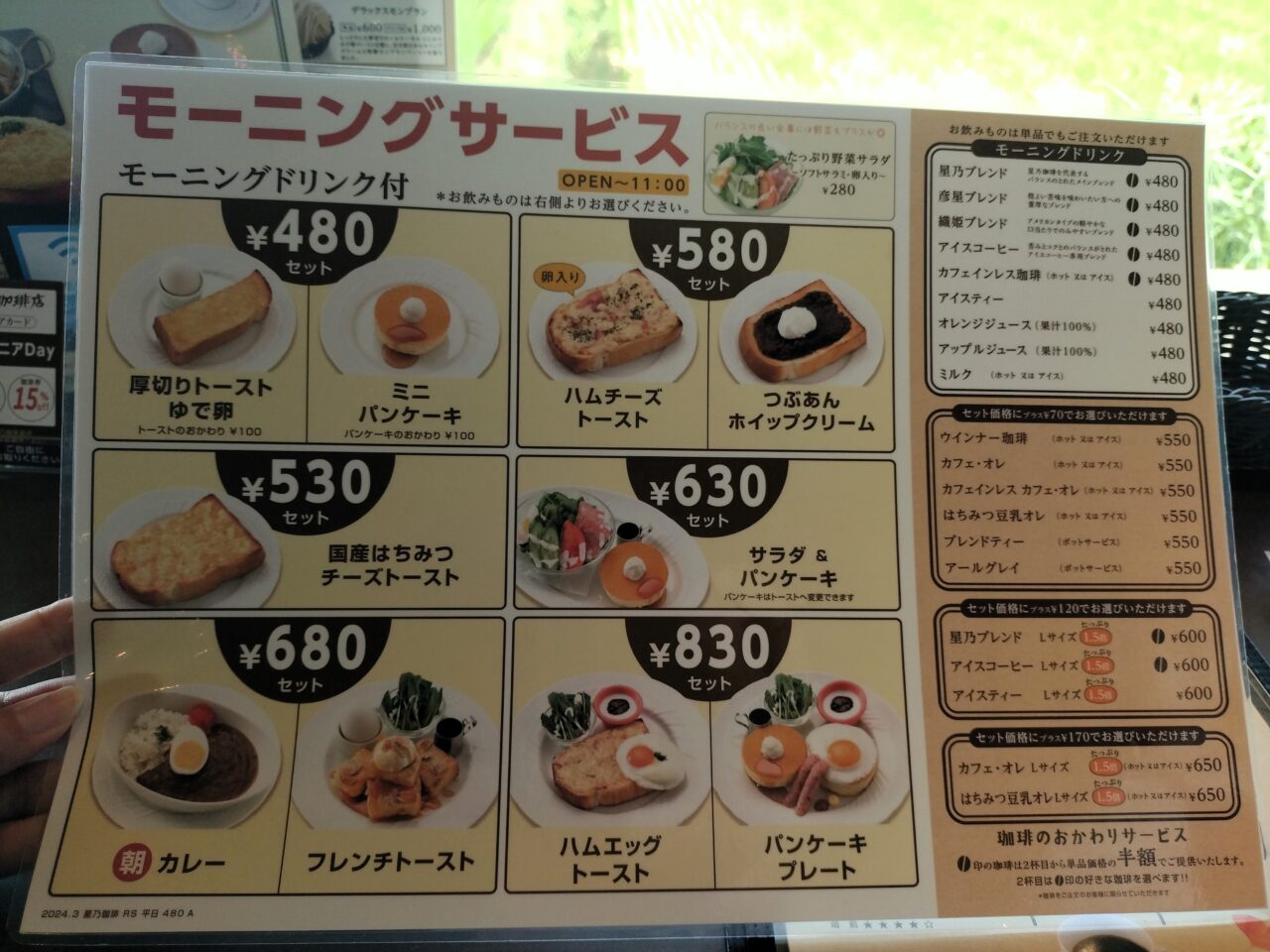 モーニングサービスには、ドリンクもついているのでとってもお得ですね。ミニパンケーキからカレーまでさまざまなメニューがあります。
