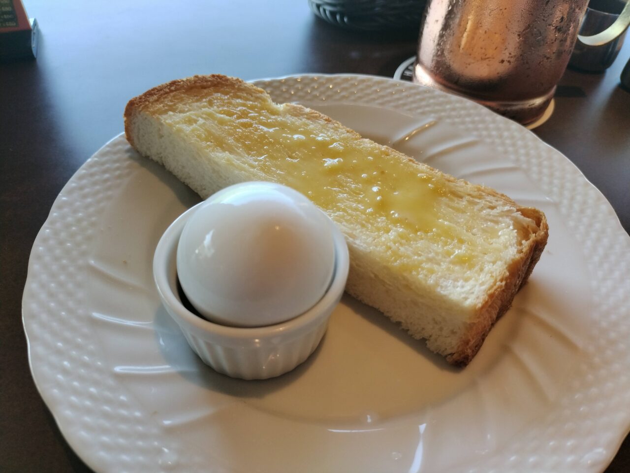 モーニングサービスは、オープンの8時から11時まで注文できます。今回は厚切りトーストとゆで卵のセットにしました。価格は480円です。