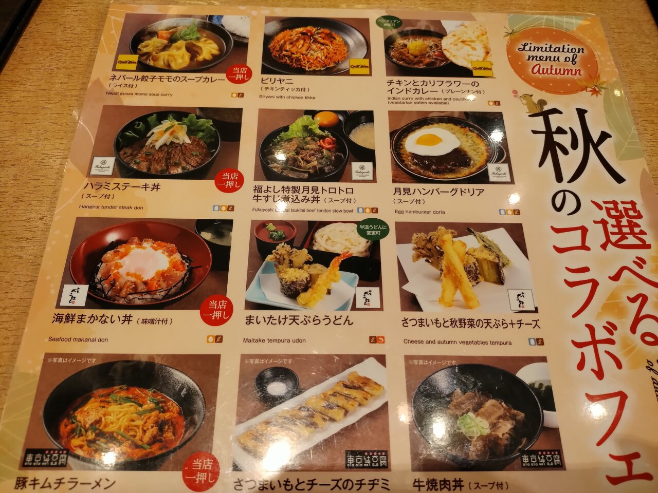 和食や洋食、中華、韓国料理、カレー、スイーツなどさまざまなお店が入った美味コレクション。「秋の選べるコラボフェア」では対象メニューから好きなものを2つ選んで注文で可能です。価格は税込1,480円。