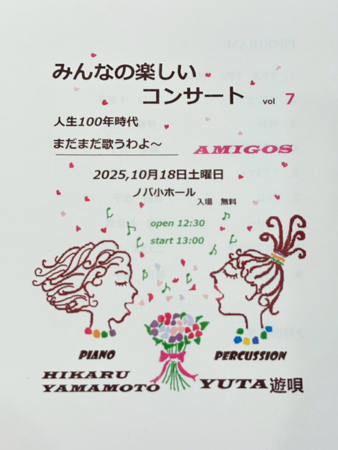 メンバーが全員70代以上で構成される「アミーゴス」による「みんなの楽しいコンサート♪vol 7」が、2025年10月18日(土)ノバ小ホールにて開催されるそうですよ。