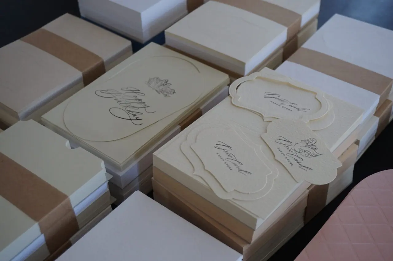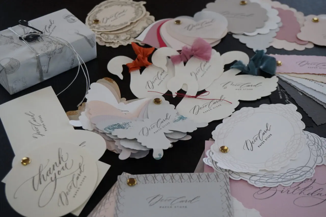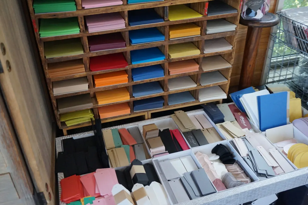 毎回好評の紙の量り売りイベント「紙ビュッフェ」。ずらりと並んだ特殊用紙やタグ、封筒の中から自由に選んで量り売りで購入できます。