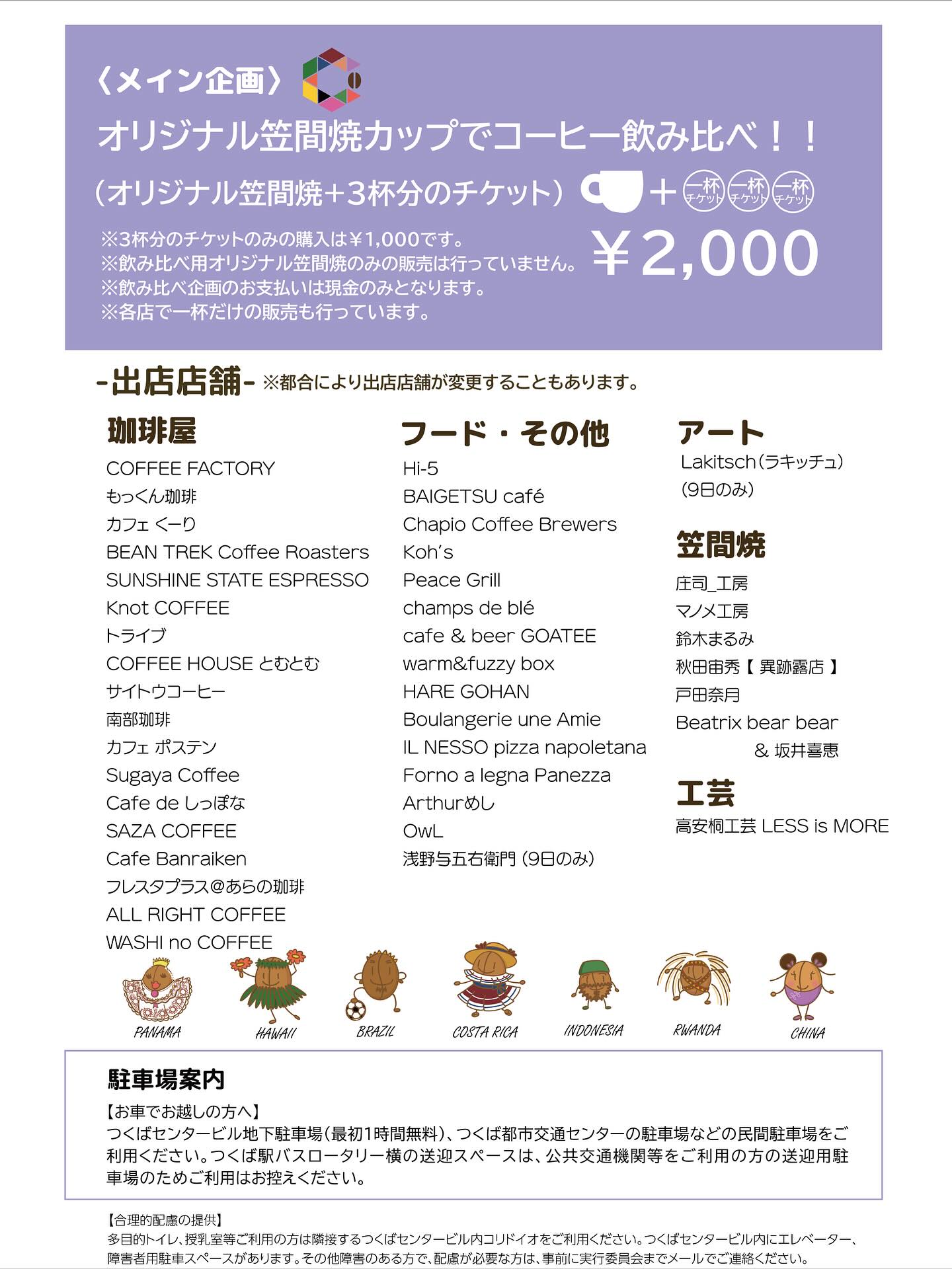 出店されている各コーヒー店で1杯ずつ販売されるほか、つくばコーヒーフェスティバルのオリジナルマグカップがついてくる「オリジナル笠間焼カップ+3杯分チケット(税込2,000円)」も発売されます(マグカップなしの飲み比べ3杯券のみの場合は税込1,000円となります)。