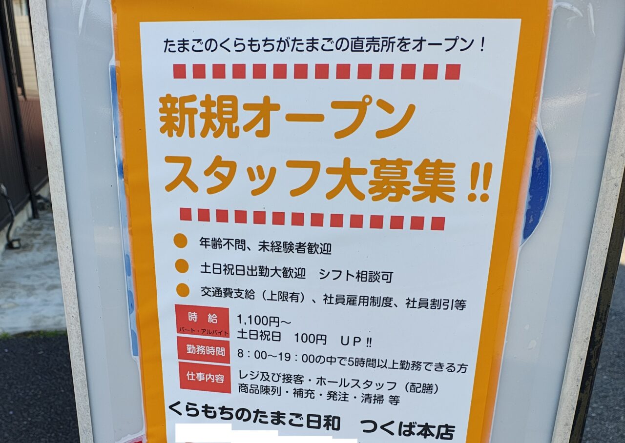 現場に行ってみると「くらもちのたまご日和 つくば本店」の求人のポスターが貼ってありました。