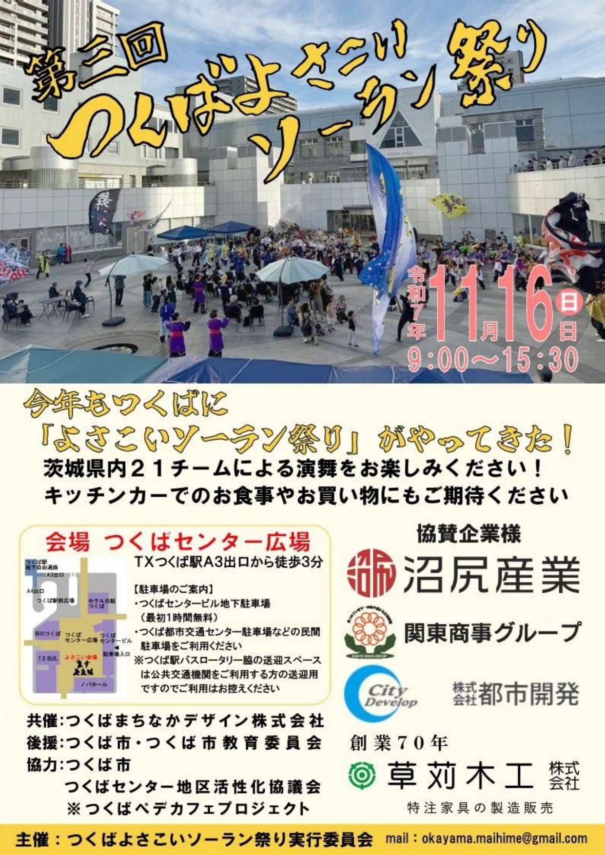 2025年11月16日(日)「第三回つくばよさこいソーラン祭り」が開催されます!今年もつくばセンター広場に、茨城県の「よさこいソーラン」のチームが集結しますよ。