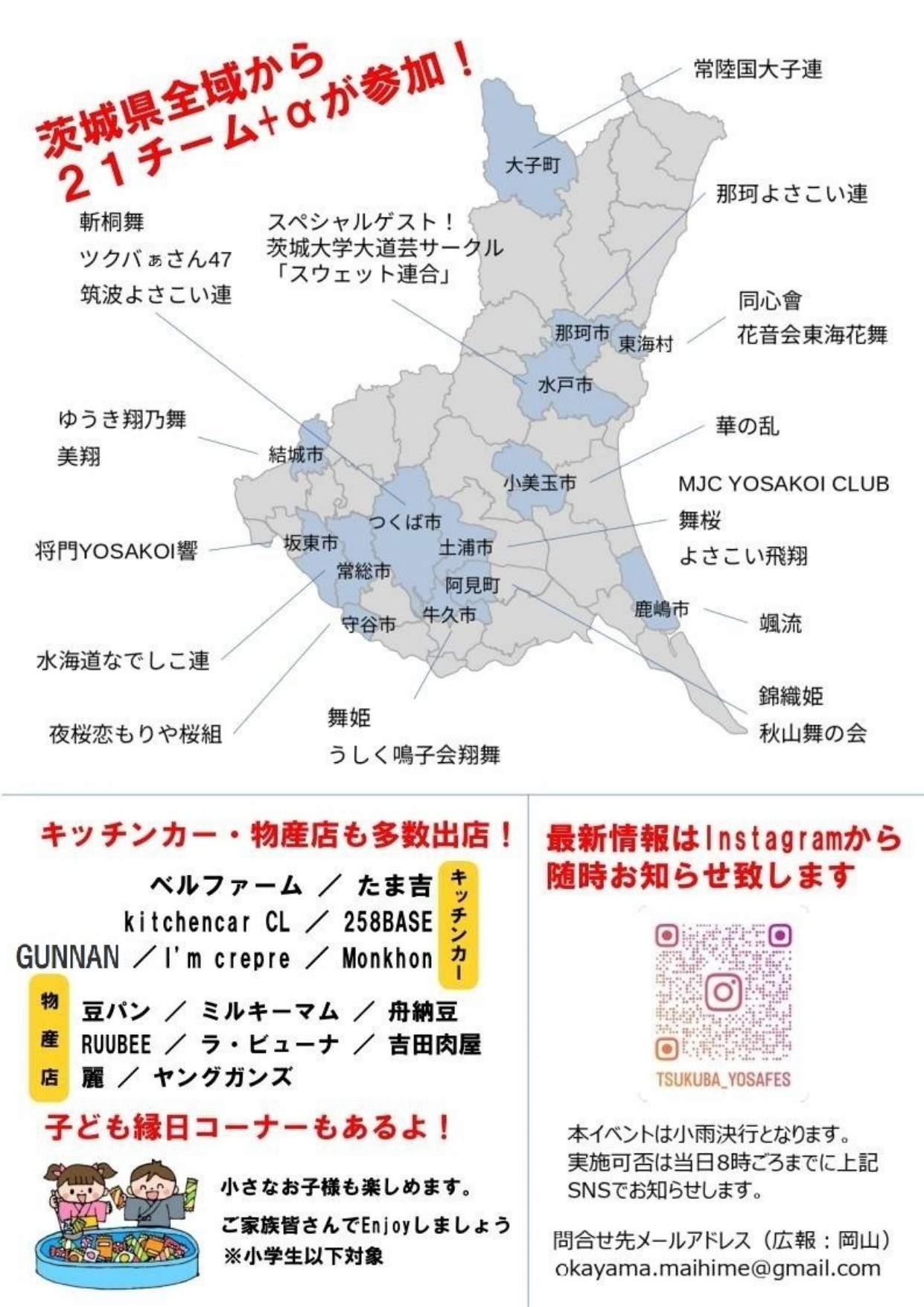 「第三回つくばよさこいソーラン祭り」は入場無料、小雨決行となります。実施可否は当日8時ごろまでに公式SNSでお知らせされるとのこと。