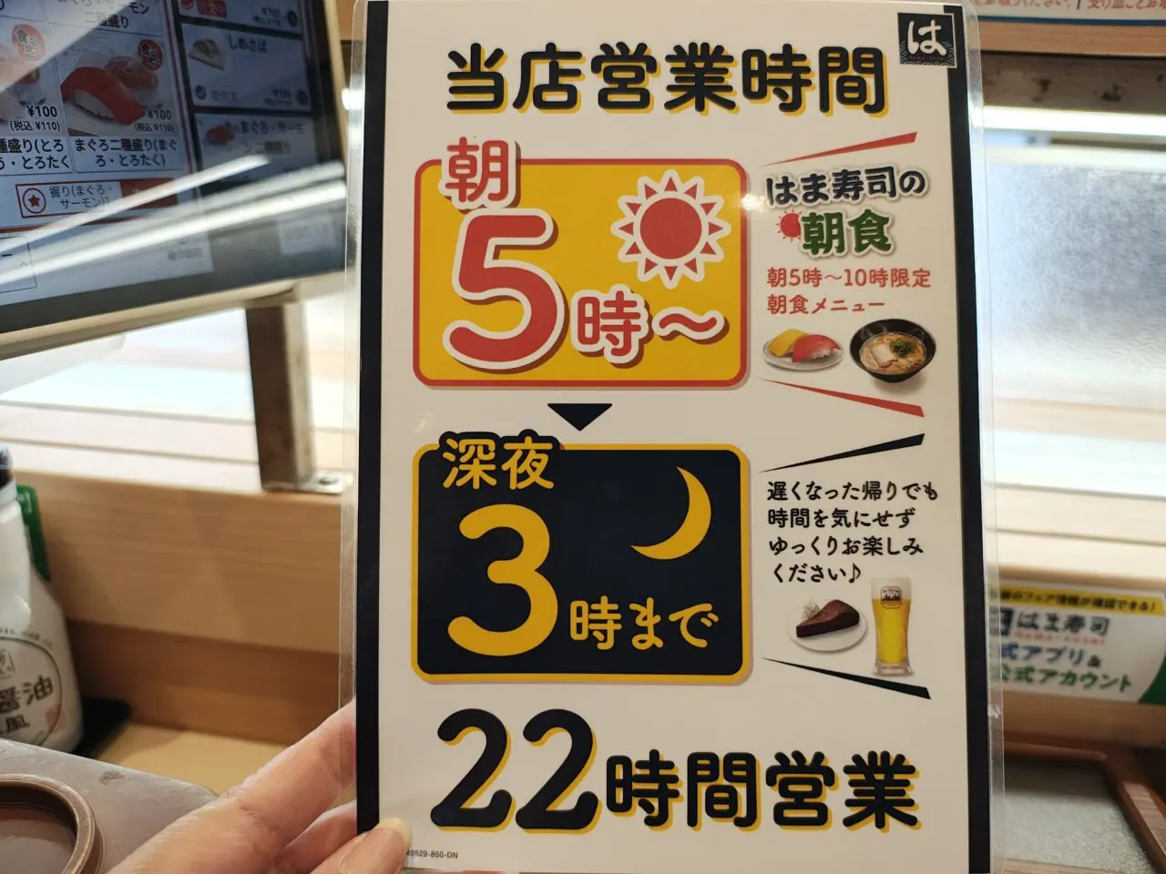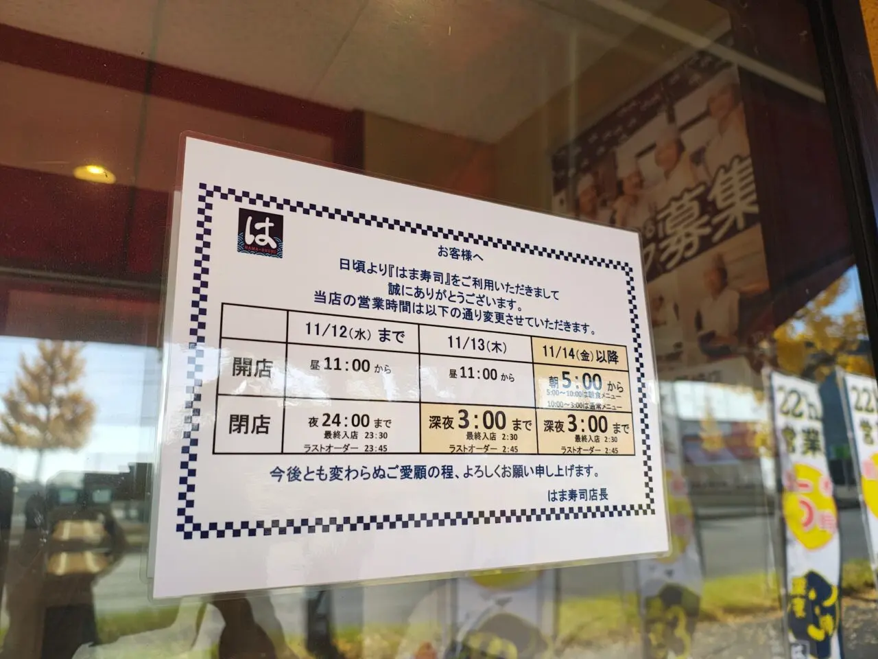 はま寿司つくば小野崎店は以前は11時開店24時閉店だったのが、2025年11月14日以降、5時開店3時閉店になったのだとか。