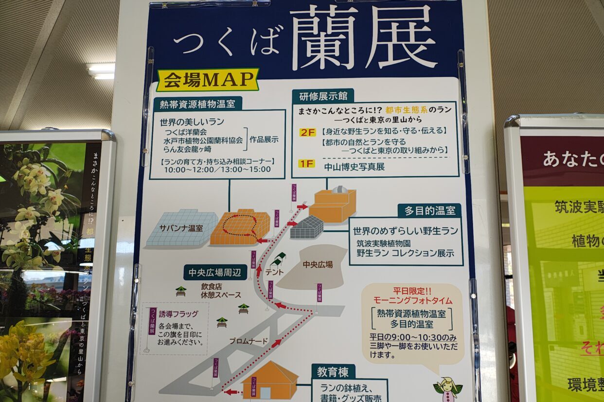「つくば蘭展」の会場は、筑波実験植物園の教育棟、熱帯資源植物温室、多目的温室、園内、研修展示館となります。