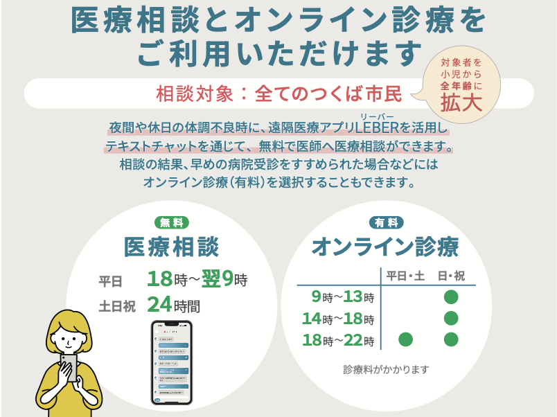 2025年12月1日、全てのつくば市民(全年齢)を対象とした「つくば市休日夜間デジタル急患センター」が開始されました。遠隔医療アプリ「LEBER(リーバー)」を使用して、医療機関の診療時間外に医師による医療相談やオンライン診療を受けることができます。