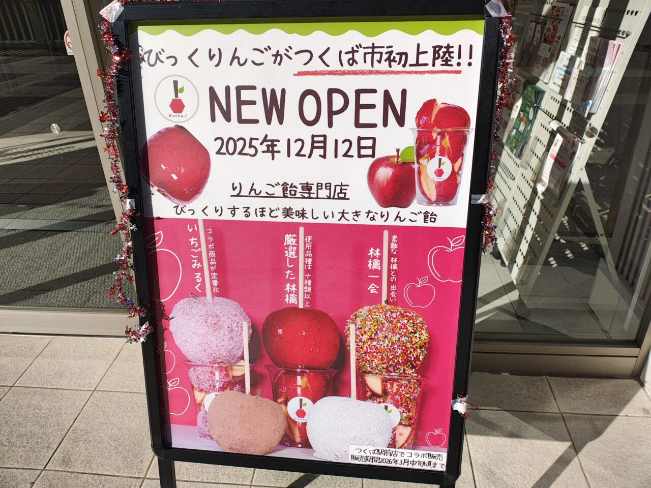 12月12日から販売スタートした「びっくりんご」は、つくば市初進出のりんご飴専門店なのだとか。種類が多く、どれもおいしそうなので迷ってしまいますが、今回は「カラフルチョコ(税込830円)」とクリスマスまでの期間限定の「ベリーチョコ(税込780円)」にしました。