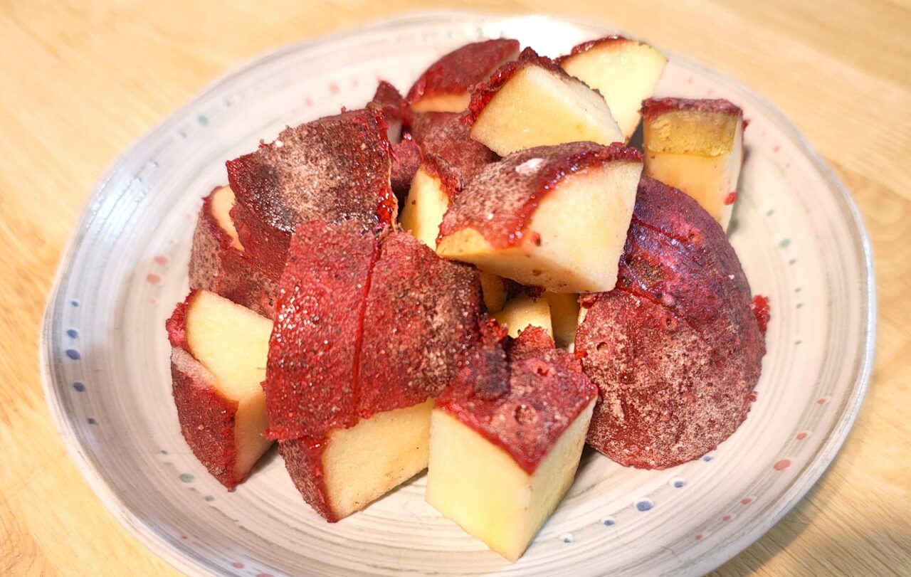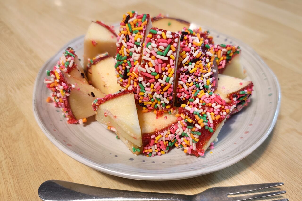 見た目がかわいい「カラフルチョコ」。りんごのシャキシャキ感とチョコの食感が楽しいりんご飴です。