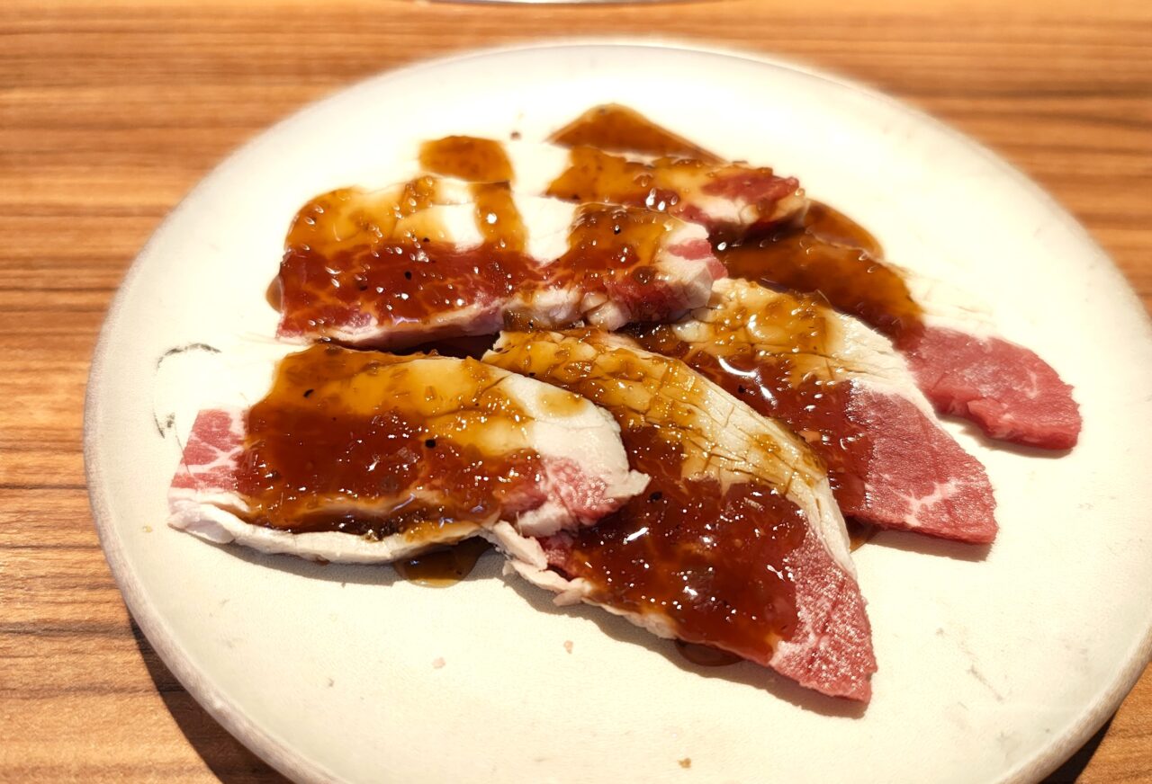 まずはこちらの「いちばん熟成上ロース~トリュフ香るソース~」。いちばんの人気メニュー熟成上ロースに、トリュフが香るソースをかけた贅沢なロースです。トリュフは焼肉とも相性抜群!