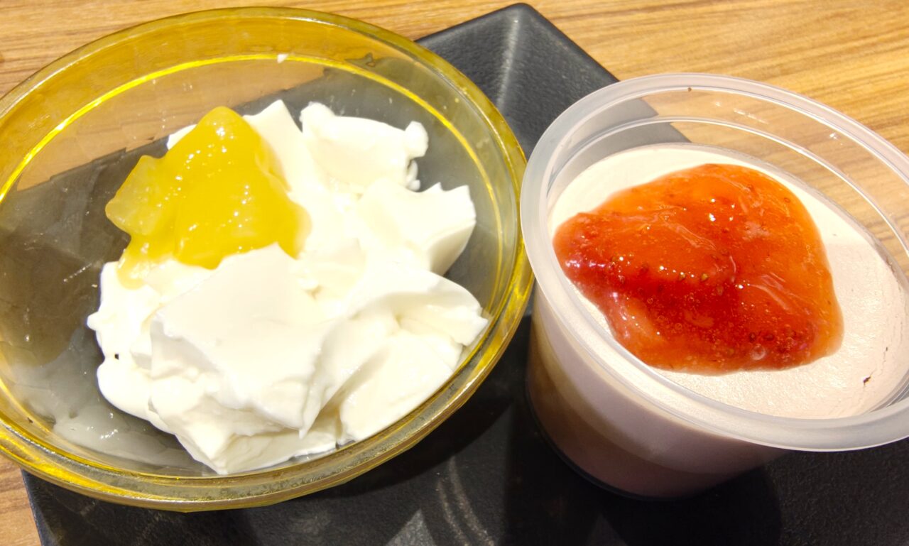 デザートの「2層のチョコムース」と「ごろっとりんごのパンナコッタ」。焼肉のあとに食べたい冷たいフルフル食感のスイーツです。
