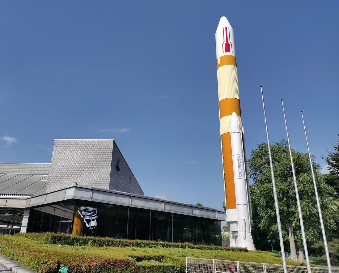 つくばエキスポセンターの屋外に展示されている「H-IIロケット実物大模型」。宇宙開発を体感できる、科学の街・つくばのシンボル的な存在です。
