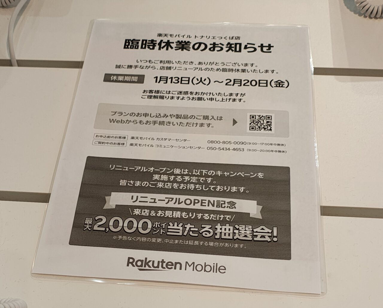 楽天モバイルを利用しているかたやこれから契約を考えている方はご注意ください。楽天モバイル トナリエつくば店が店舗リニューアル工事のため、2026年1月13日(火)から一時休業されるそうです。