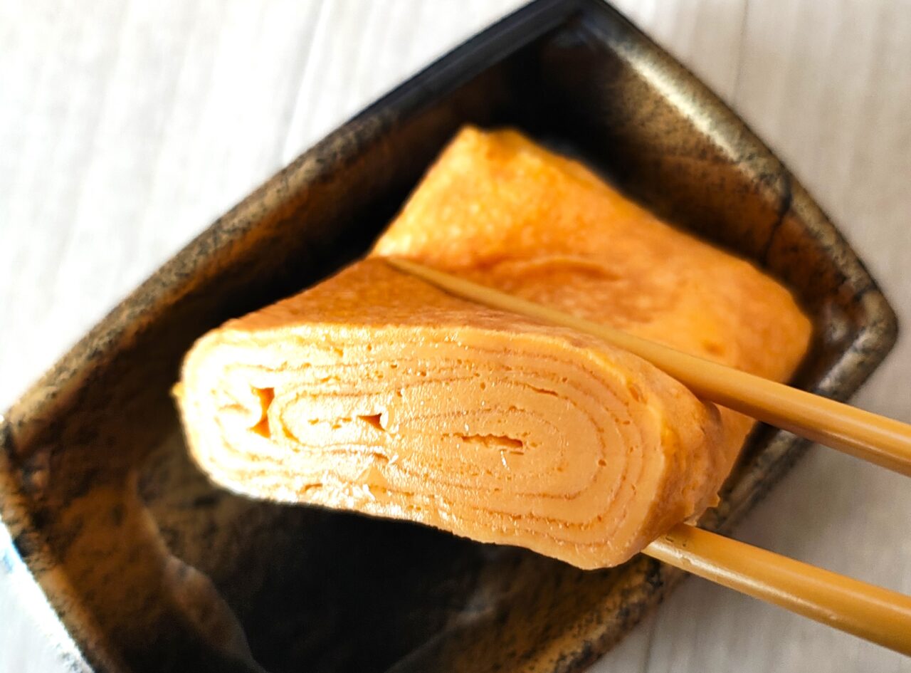 黄身の濃い色がきれいで見た目にも鮮やかな「店内焼き上げ 玉子焼き(ほのあかね)」。だしの旨みと甘さのバランスがよくおいしいので、まだ食べたことがない方はぜひお試しくださいね。
