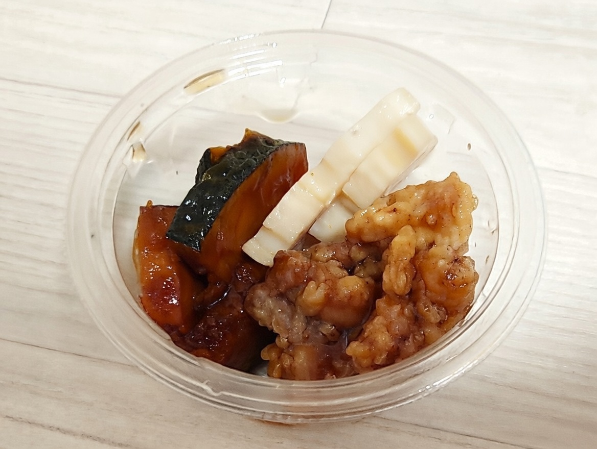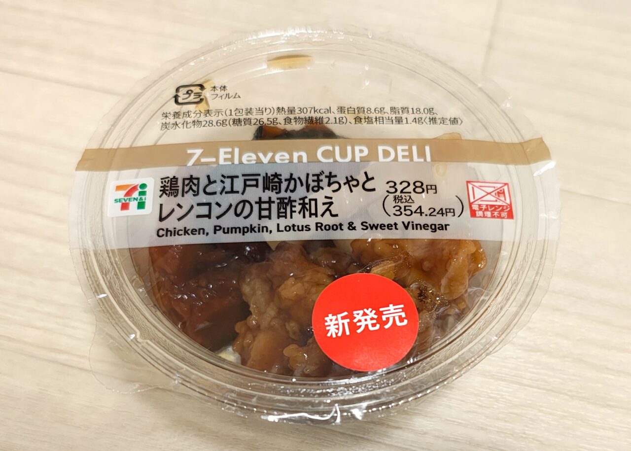続いて、茨城が誇るブランド野菜「江戸崎かぼちゃ」を使用した「鶏肉と江戸崎かぼちゃとレンコンの甘酢和え 328円(税込354.24円)」。