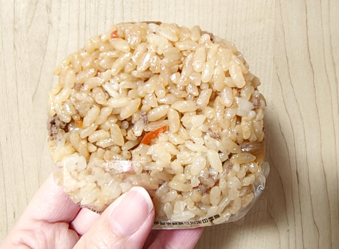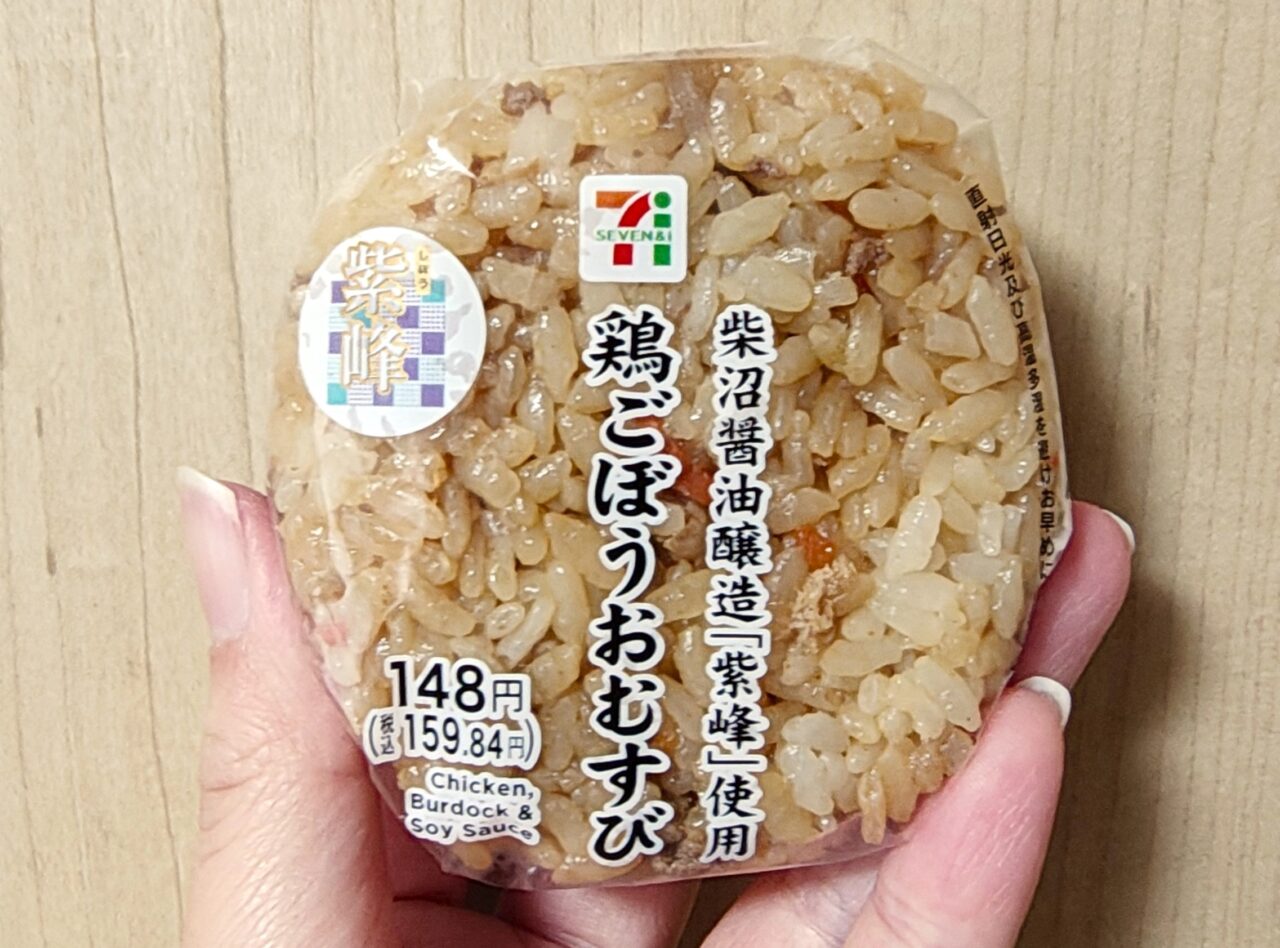まずは「鶏ごぼうおむすび 紫峰使用 148円(税込159.84円)」。シャキシャキ食感のごぼうに、旨みたっぷりの鶏ひき肉を合わせた炊き込みご飯のおむすびです。