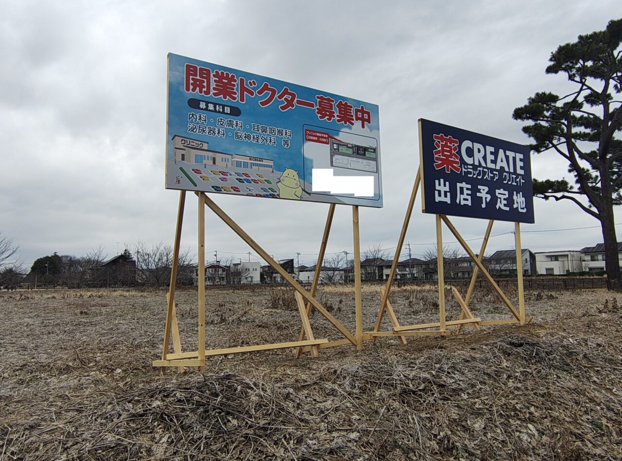先日(2026年3月上旬)、学園の森1丁目を通ったところ「ドラッグストア クリエイト」が建設されるという看板を見つけました。