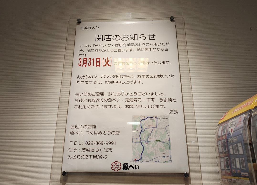 とても残念なニュースが入ってきました。「魚べい つくば研究学園店」が2026年3月31日(火)の営業を最後に、閉店されるそうです。