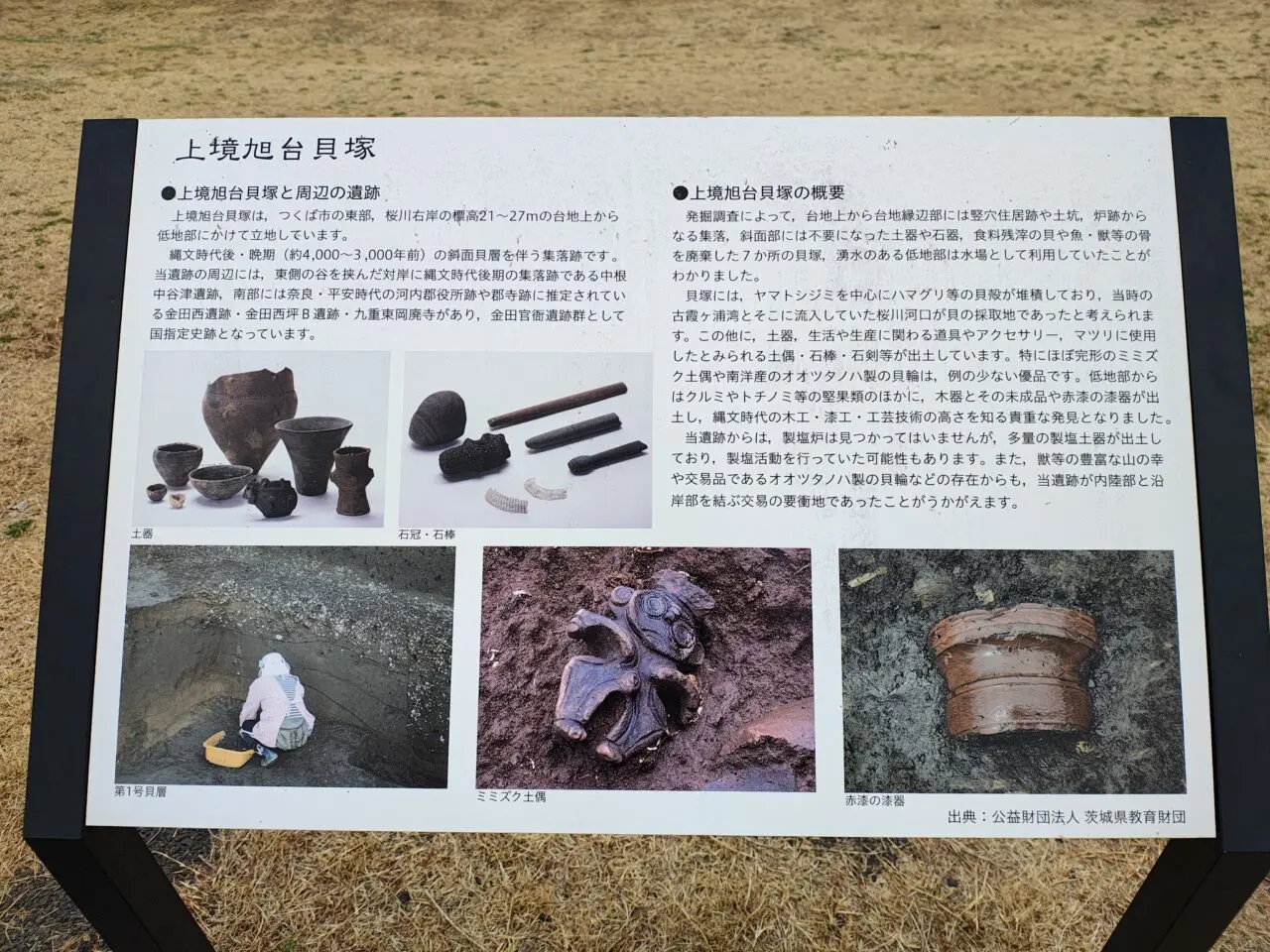 公園内には上境旭台貝塚に関する説明があります。上境旭台貝塚では、ほぼ完全のミミズク土偶や南洋産の貝を使った貝輪などが発掘されており、全国的にもとても珍しいものなのだとか。