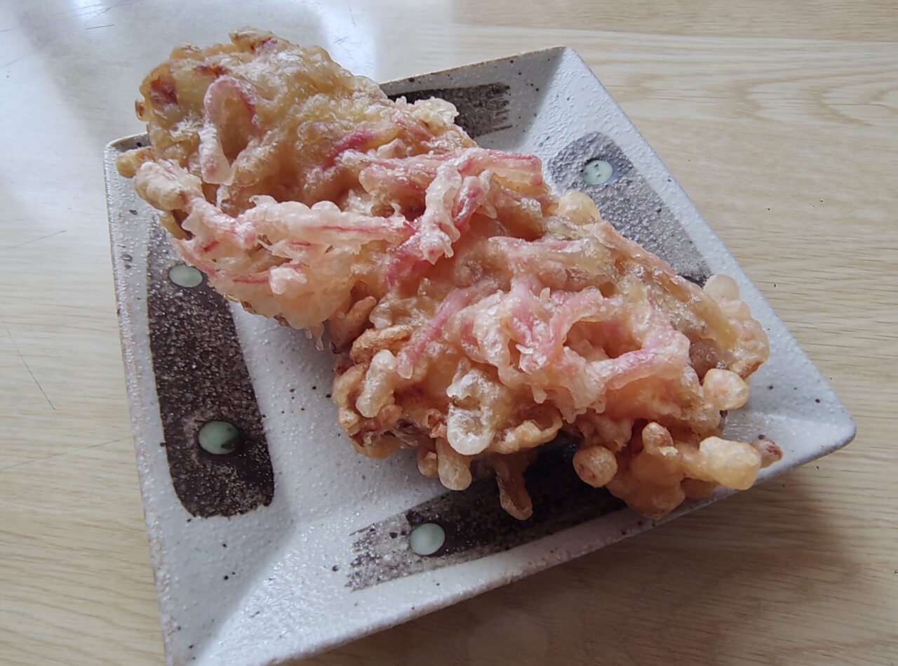 衣にはたくさんの紅生姜が入っています。紅生姜のさわやかな風味がアクセントになっていて、揚げ物なのに重たさを感じにくいのが◎。