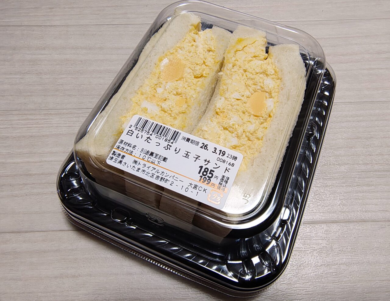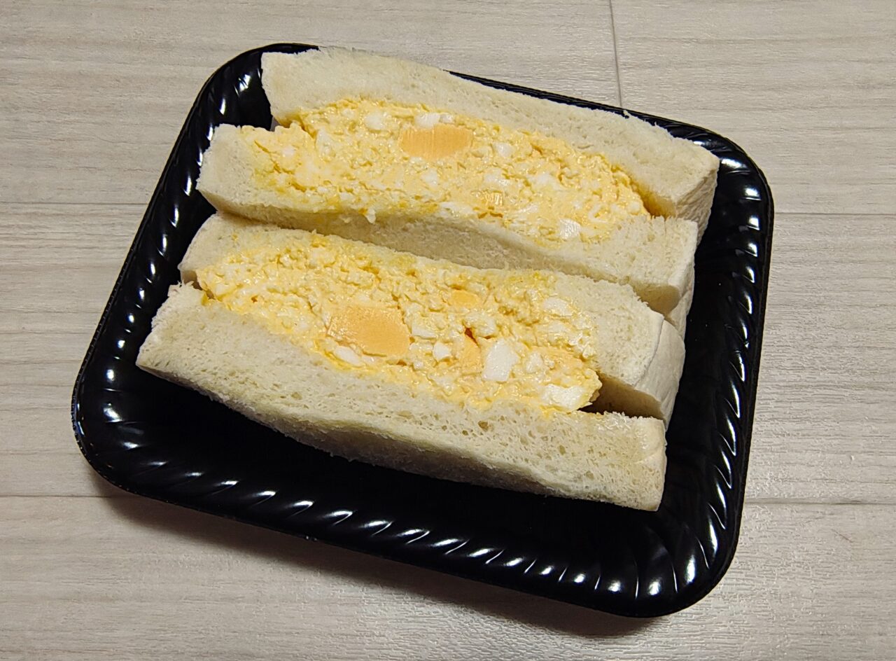 「白いたっぷり玉子サンド(税込199円)」。白いふわふわなパンに玉子サラダがたっぷり。