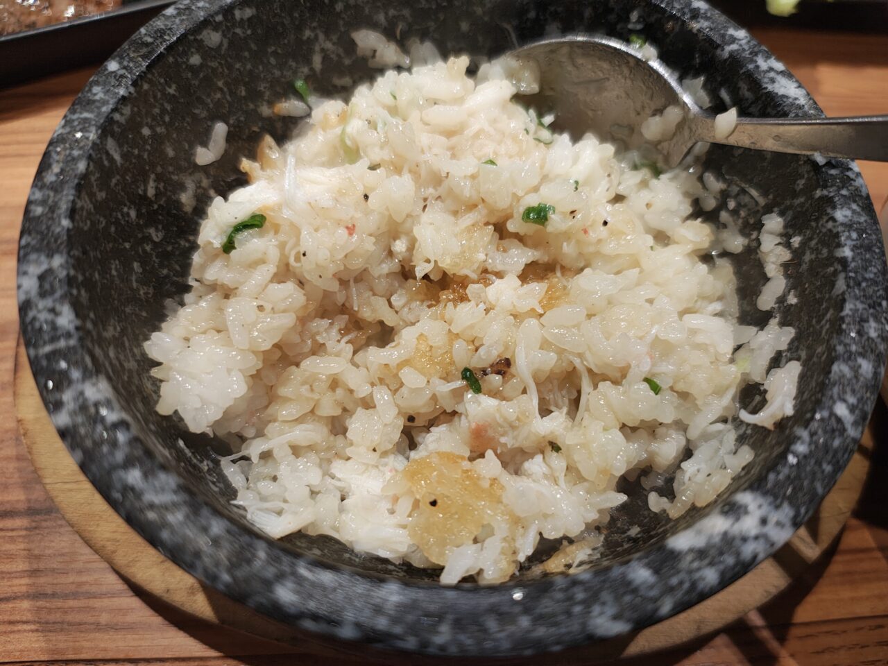 バターが香る「本ズワイガニの石焼カニめし」。おこげとカニのうま味がおいしい絶品焼き飯です。