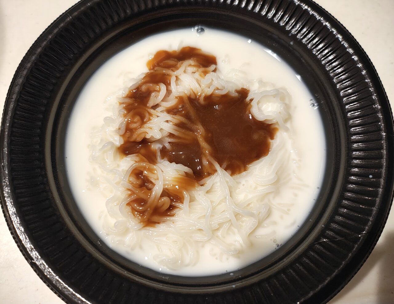 中にはとうふ麺と豆乳仕立てが一緒に入ったカップとスープの素が入っています。黒い容器は電子レンジ対応とのことで、こちらにスープの素を入れて温めるだけで完成します。