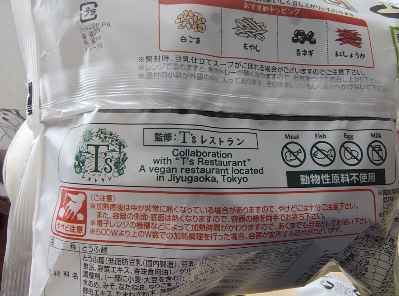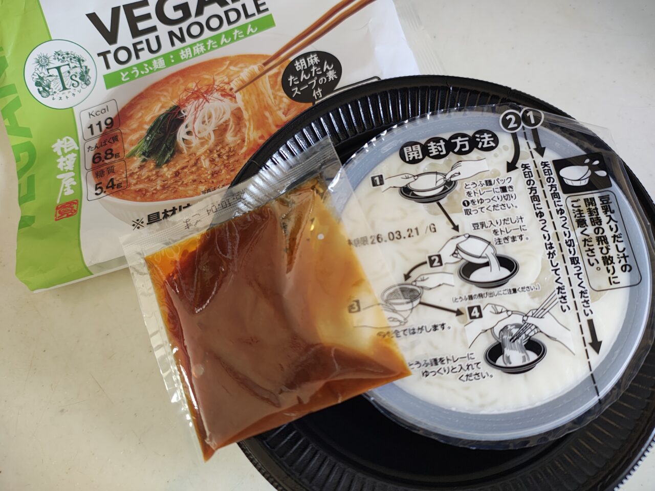 今回筆者が購入したのは、大豆100%の麺「とうふ麺」に、東京・自由が丘のヴィーガン料理レストラン「T’s(ティーズ)レストラン」監修のベジ白湯スープのたれをセットにした「胡麻たんたん」と「ベジとんこつ風」の2種類です。
