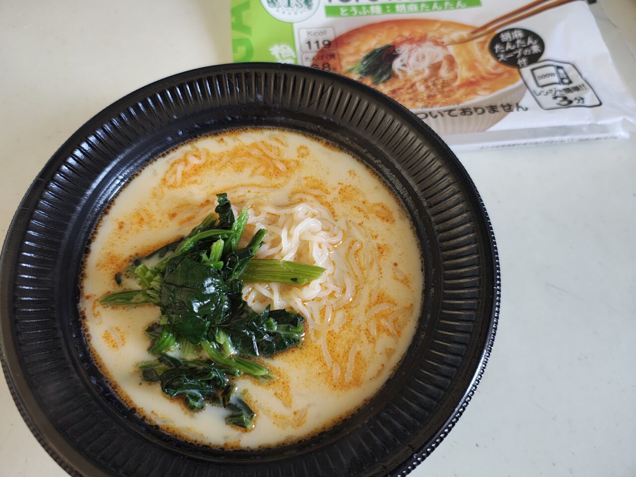 まずはこちらの「VEGAN TOFU NOODLE 胡麻たんたん(税込214円)」から。今回はほうれん草をトッピングしてみました。